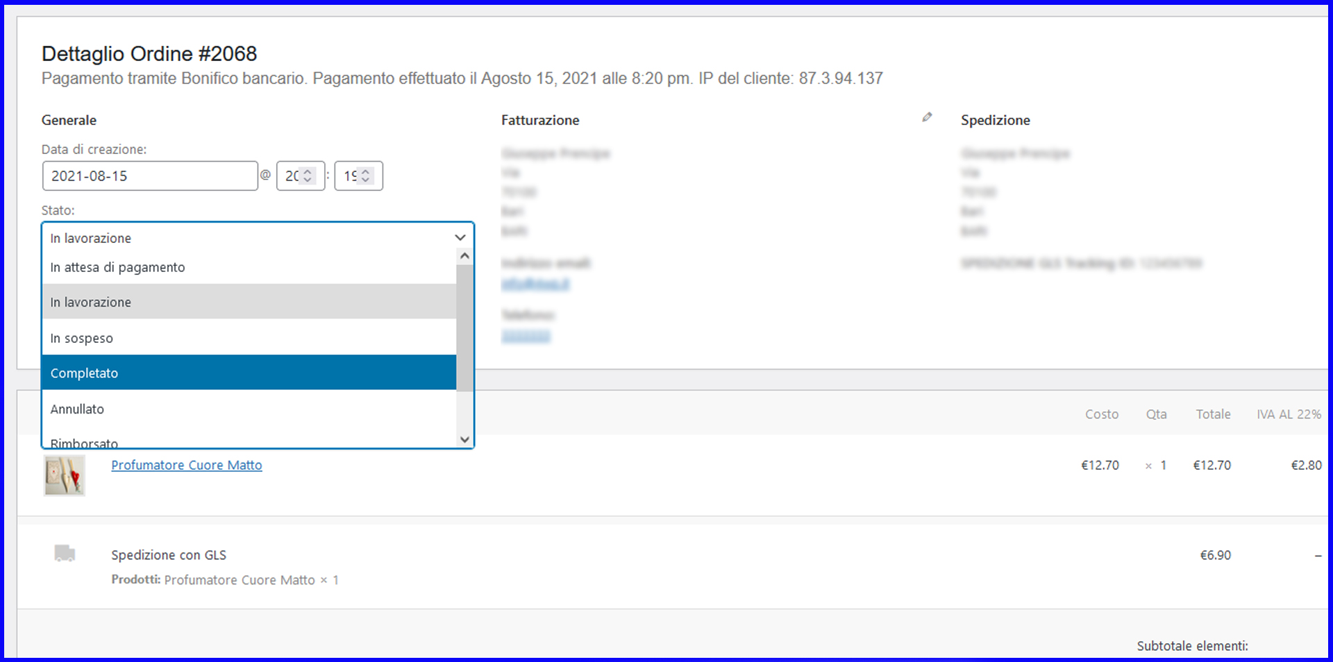 Per aggiungere il codice di tracciamento all’ordine, ed avvisare il cliente automaticamente tramite email, ti basterà accedere all’ordine dal pannello amministrativo, visualizzare l’ordine, e compilare il campo “GLS TRACKING ID” situato sul lato destro